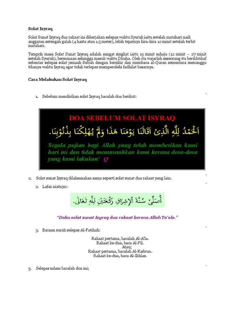 Solat sunat Isyraq pukul berapa. View Cara Solat Sunat Isyraqdocx from CTU 253 at Universiti Teknologi Mara. Selain itu orang yang mengamalkan sembahyang sunat Isyraq pula dikurniakan pahala seperti pahala Haji dan Umrah.